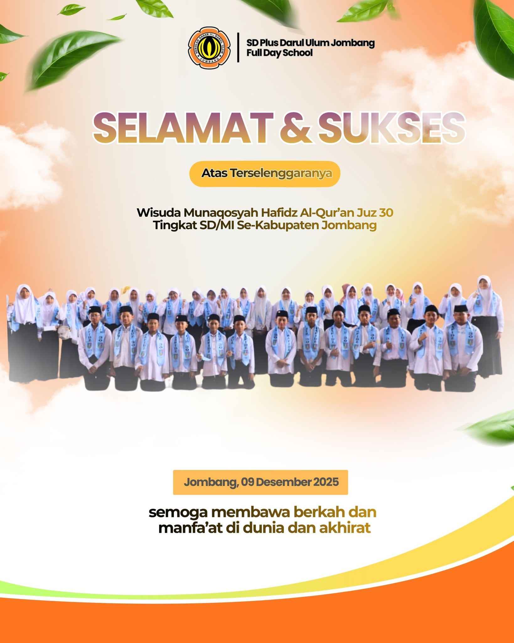 Jombang, 9 Desember 2025 – Kabar membanggakan datang dari SD Plus Darul Ulum Jombang. Sebanyak 37 siswa-siswi dinyatakan lulus 100 persen dalam kegiatan Munaqosah Juz 30 yang dilaksanakan pada 9 Desember 2025 di Masjid Jami’ Baitul Mukminin Jombang.